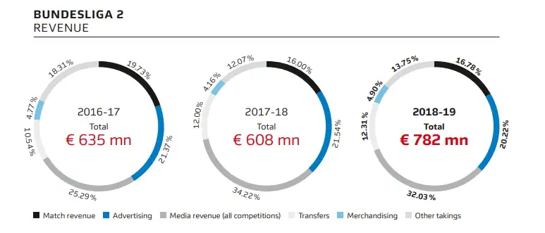 Her yıl yayınlanan ve bu yıl pandemiden birkaç hafta önce 18 Şubat 2020’de yayınlanan 2020 DFL ekonomik raporunda ise Bundesliga kulüplerinin elde ettiği gelirin ilk kez 4 milyar Euro’yu aştığını ve üst üste 15. kez gelir elde edildiğini belirtilmişti. Rekorlar sadece Bundesliga bünyesinde kırılmıyordu; 2. Bundesliga’nın toplam gelirlerinde de geçen sezon tüm zamanların en yüksek seviyesine ulaşarak 782 milyon Euro’yu bulmuştu.